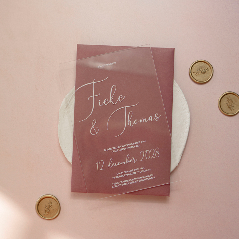 De transparante kaart brengt een elegante en minimalistische uitstraling, terwijl jullie namen en trouwdatum prachtig naar voren komen. Het heldere acryl zorgt ervoor dat het ontwerp modern en tijdloos oogt, perfect voor een luxe bruiloft. Less is more!