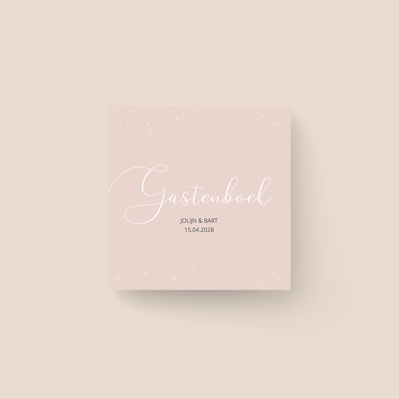 Een tijdloos en stijlvol gastenboek in zacht oudroze met subtiele spetters en sierlijke witte kalligrafie. Perfect passend bij jullie trouwkaarten, sluitzegels en welkomstbord.