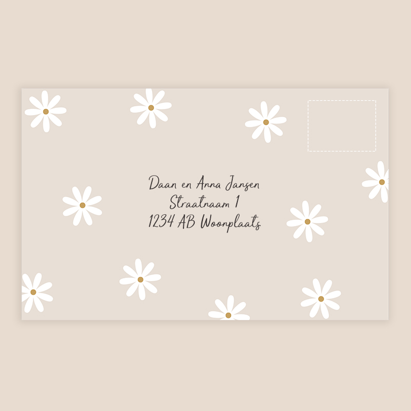 Ontwerp je eigen unieke envelop met bloemetjes, helemaal in stijl van het geboortekaartje. Kopieer de illustraties van de kaart en plak deze in het ontwerp van de envelop, eenvoudig in de editor. Open het ontwerp van de kaart en het ontwerp van de envelop in 2 verschillende tabladen om het overzicht te bewaren.