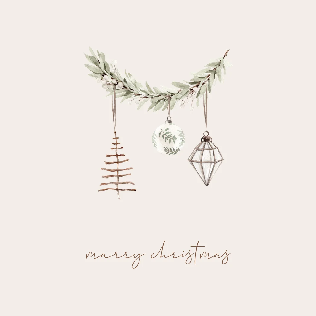 Vier de feestdagen met deze stijlvolle, minimalistische kerstkaart, voorzien van prachtige illustraties van een takje met kerstornamenten. Deze kerstkaart is perfect voor wie houdt van een rustieke en moderne uitstraling.