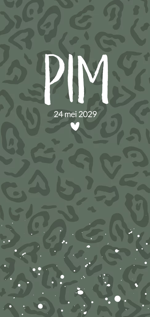 Ontwerp zelf het geboortekaartje voor jullie kindje. Een prachtige groene kaart met een stoere panterprint. Naam, geboortedatum en illustraties zijn aangebracht in goudfolie, op beide zijden van de kaart. Je kunt de kleur van de folie aanpassen naar roségoud-, zilver-, koper of zwartfolie. Het lettertype en de achtergrondkleur kun je ook wijzigen. Prachtig op linnen karton.