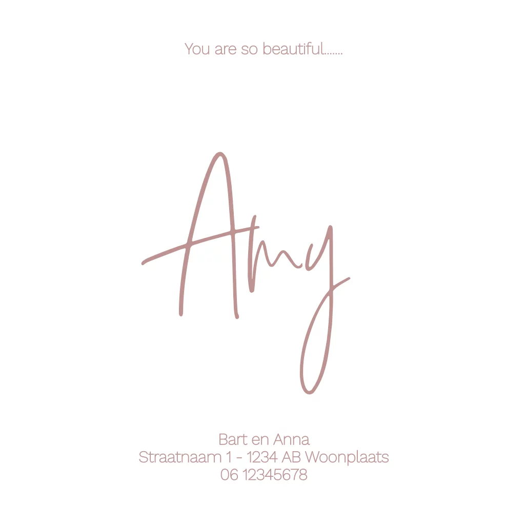 Ontwerp zelf het geboortekaartje voor jullie kindje. Een prachtig oudroze kaart met een subtiele panterprint. Voorbeeldnaam Amy is aangebracht in zilverfolie. Je kunt de kleur van de folie aanpassen naar roségoud-, goud-, koper of zwartfolie. Het lettertype en de achtergrondkleur kun je ook wijzigen. Prachtig op linnen karton.