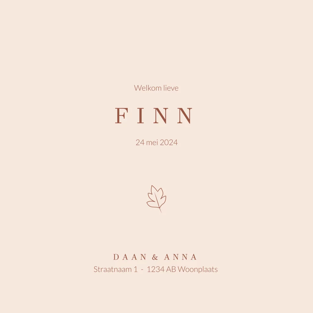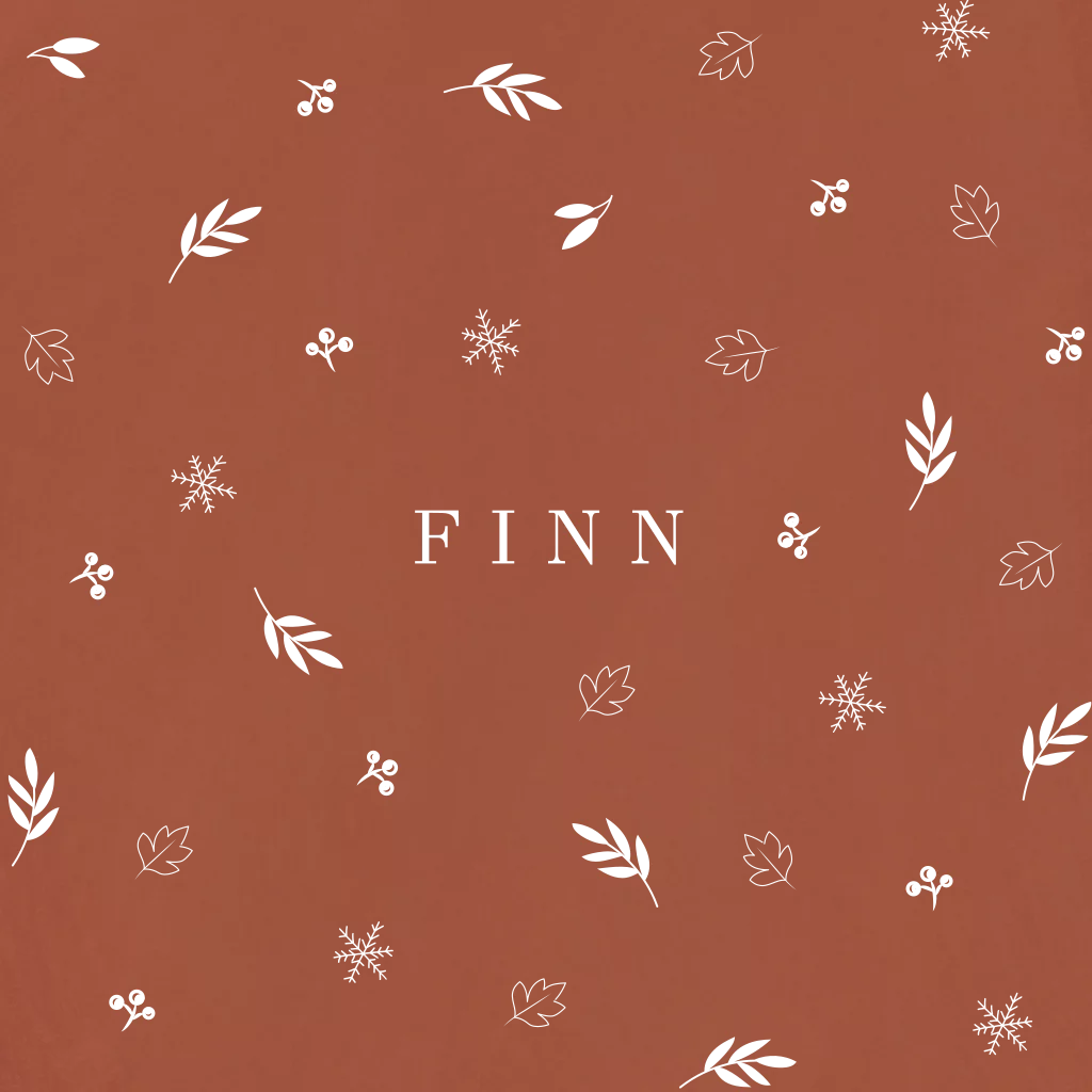 Ontwerp zelf het geboortekaartje voor jullie kindje. Een winters geboortekaartje met een roestkleurige achtergrond. De voorbeeldnaam Finn, geboortedatum en elementen zijn aangebracht in goudfolie. Je kunt de kleur van de folie aanpassen naar zilver-, roségoud-, koper of zwartfolie. Het lettertype en de achtergrondkleur kun je ook wijzigen. Prachtig op linnen karton.