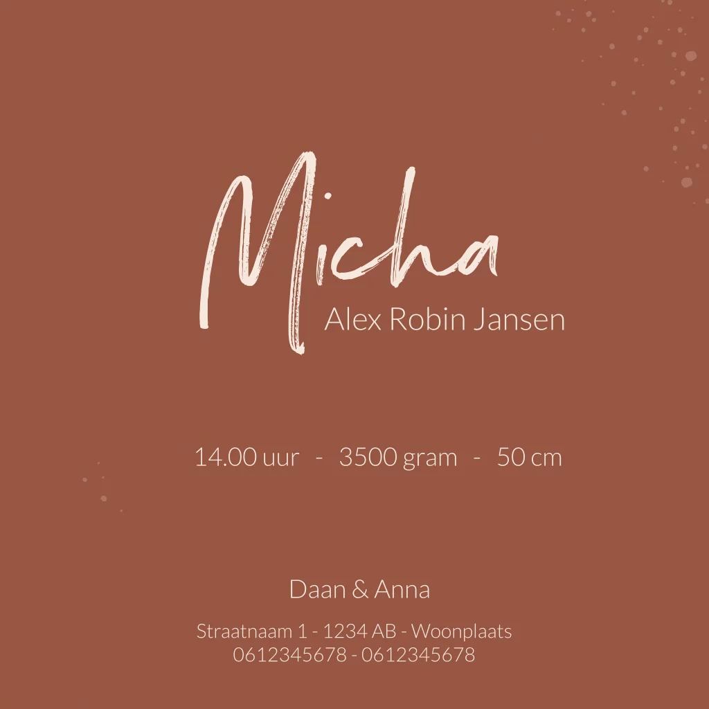 Ontwerp zelf het geboortekaartje voor jullie kindje. Een prachtig genderneutraal stoer geboortekaartje met een roest bruine achtergrond. Naam, geboortedatum en illustraties zijn aangebracht in goudfolie. Je kunt de kleur van de folie aanpassen naar roségoud-, zilver-, koper of zwartfolie. Het lettertype en de achtergrond kun je ook wijzigen. Prachtig op linnen karton.