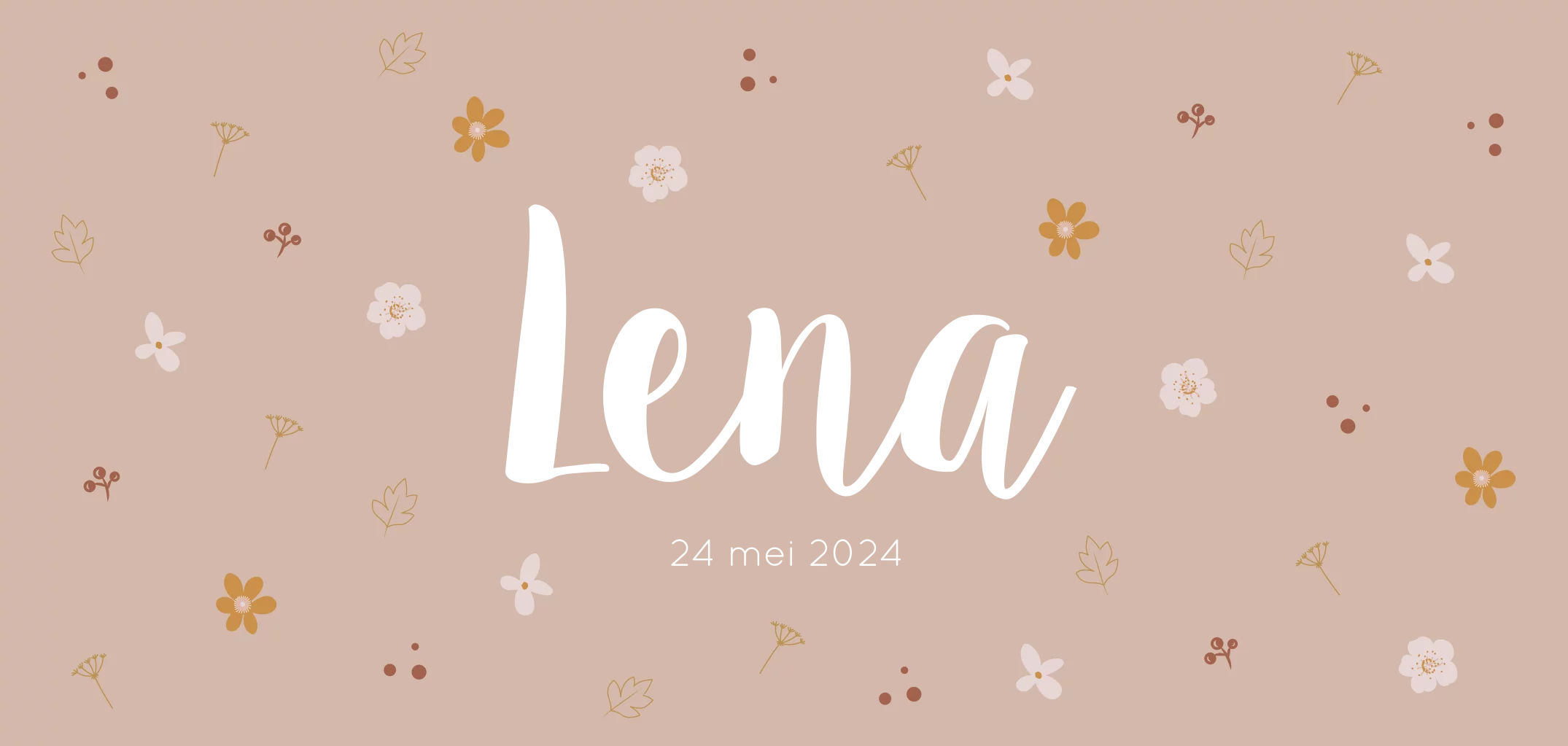 Ontwerp zelf het geboortekaartje voor jullie kindje. Een prachtig kaartje met geïllustreerde bloemen. De voorbeeldnaam Lena en geboortedatum zijn aangebracht in goudfolie. Verschillende elementen kun je ook aanpassen naar folie. Je kunt de kleur van de folie aanpassen naar roségoud-, zilver-, koper of zwartfolie. Het lettertype en de achtergrondkleur kun je ook wijzigen. Prachtig op linnen karton.