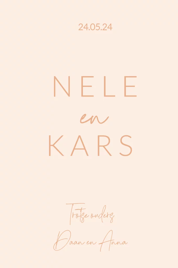 Ontwerp zelf het geboortekaartje voor jullie kindjes. Een prachtig minimalistisch en stoer geboortekaartje in een warme peach kleur, speciaal voor als je een tweeling verwacht. Het lettertype, kleur en achtergrond kun je zelf naar wens aanpassen. De boog is in goudfolie toegepast. De folie kun je aanpassen naar roségoud-, zilver-, koper of zwartfolie.