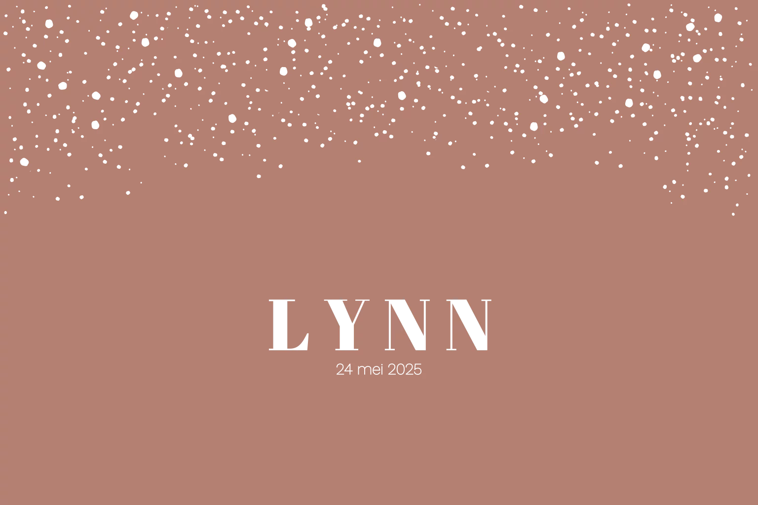 Ontwerp zelf het geboortekaartje voor jullie kindje. De voorbeeldnaam Lynn, geboortedatum en spetters zijn aangebracht in goudfolie. Je kunt de kleur van de folie aanpassen naar roségoud-, zilver-, koper of zwartfolie. Het lettertype en de achtergrond kleur zijn ook aanpasbaar. Prachtig op linnen karton.