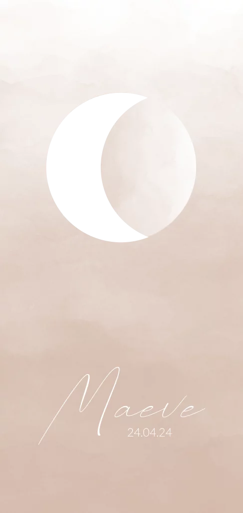 Geboortekaartje Maeve - Hoe stond de maan tijdens de geboorte van jouw kindje? Maak nu je eigen unieke geboortekaartje met de maanstand van de geboortedag van jullie kindje. Bekijk hier de maankalender om te achterhalen welke stand de maan heeft op de geboortedag van jullie kindje. Je kunt het geboortekaartje personaliseren naar wens. De achtergrond, lettertype en kleuren van het kaartje kun je zelf naar wens aanpassen. Op deze pagina lees je meer over de eigenschappen van de verschillende maanfases.