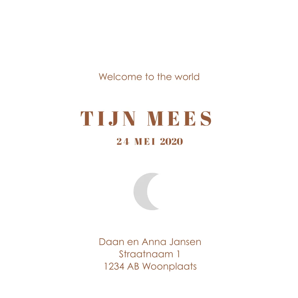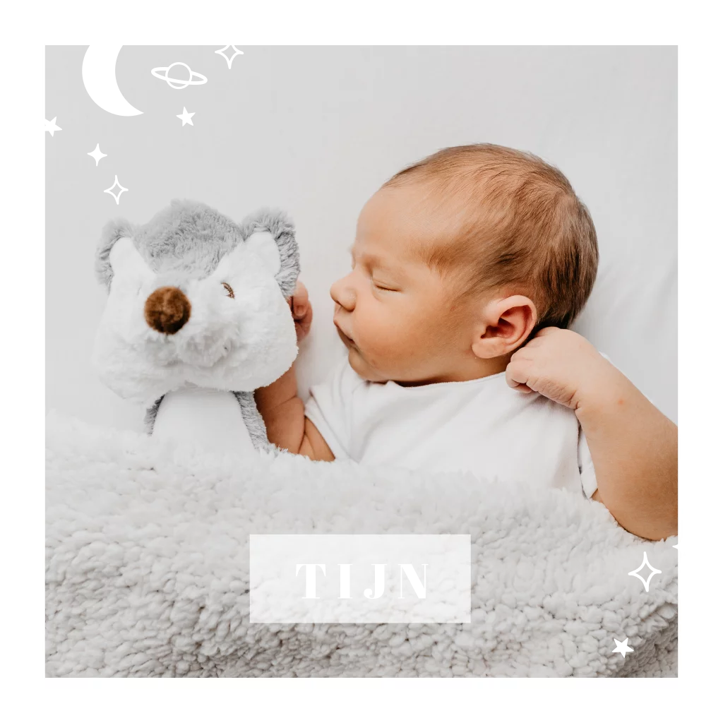 Ontwerp zelf het geboortekaartje voor jullie kindje. Een prachtig modern foto geboortekaartje met de voorbeeldnaam Tijn en de elementen aangebracht in goudfolie. Je kunt de kleur van de folie aanpassen naar zilver-, roségoud-, koper of zwartfolie. Foto: Marloes van der Linde Fotografie.