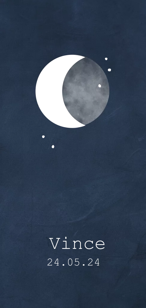 Ontwerp zelf het geboortekaartje voor jullie kindje. De voorbeeldnaam Vince, geboortedatum en maan zijn aangebracht in goudfolie. Je kunt de kleur van de folie aanpassen naar roségoud-, zilver-, koper of zwartfolie. Het lettertype en de blauwe velvet look achtergrond zijn ook aanpasbaar. Prachtig op linnen karton.