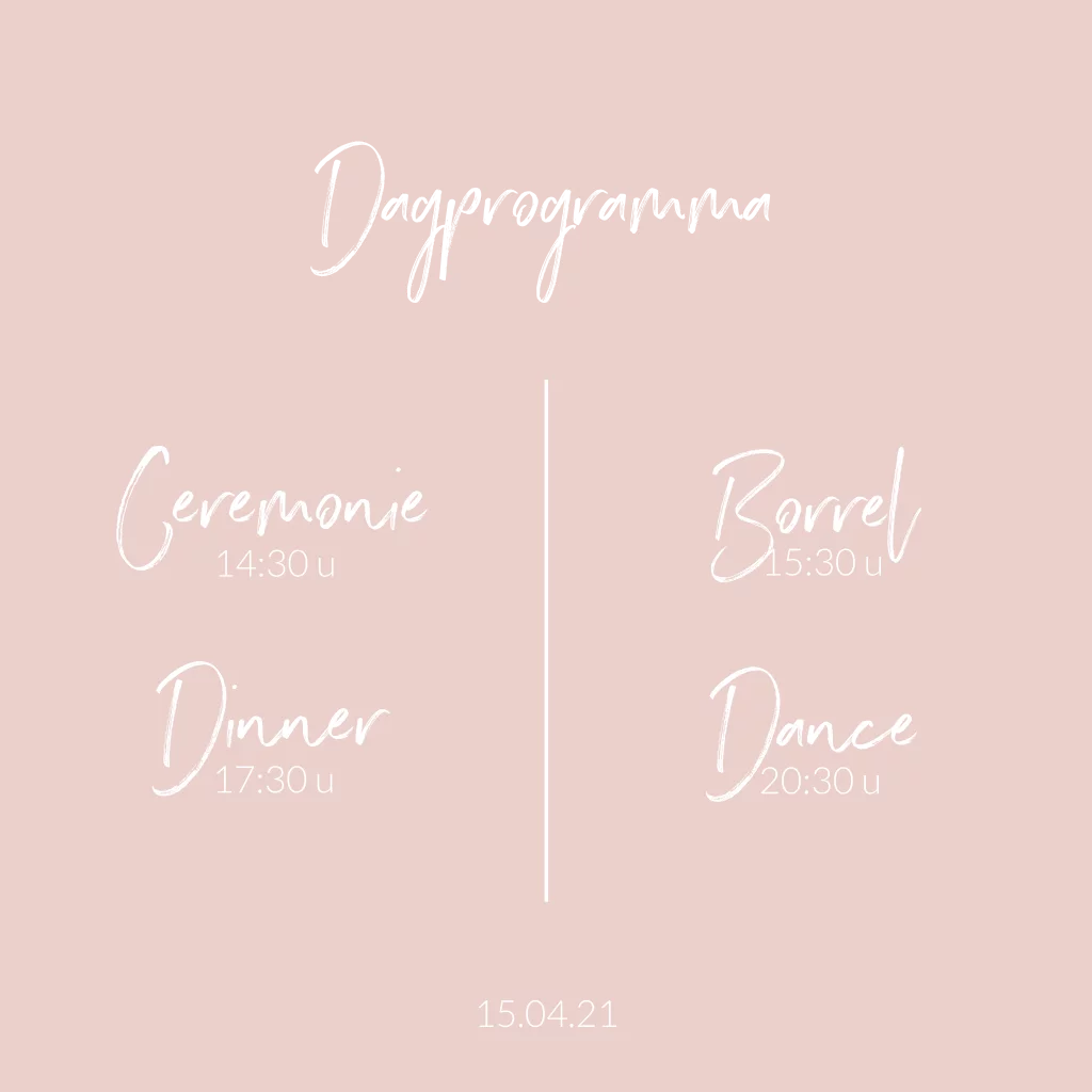 Bereid je gasten voor op het dagprogramma van jullie bruiloft. De tekst is toegepast in roségoudfolie. Je kunt de kleur van de folie aanpassen naar goud-, zilver-, koper of zwartfolie. Het lettertype en de kleur van de teksten kun je ook aanpassen. Voeg illustraties of een achtergrond uit de beeldbank toe. Prachtig op linnen karton.