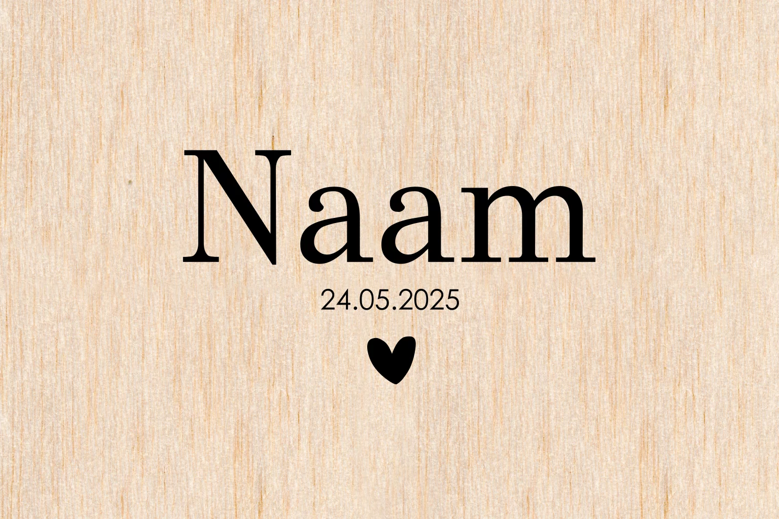 Hout is een natuurproduct. Daardoor is ieder geboortekaartje uniek en heeft zijn eigen nerven patroon. De nerf van het hout zal altijd verticaal lopen.