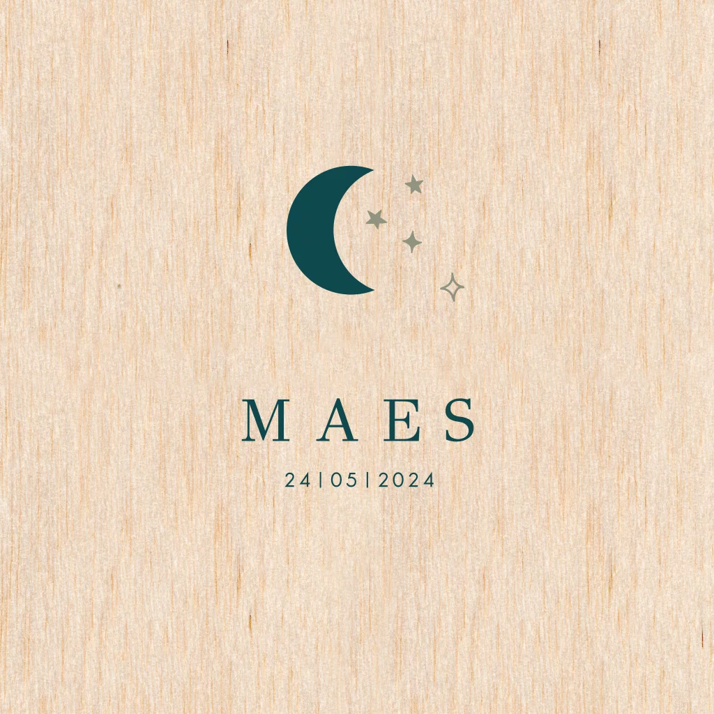 Echt houten geboortekaartje jongen met maan en sterren