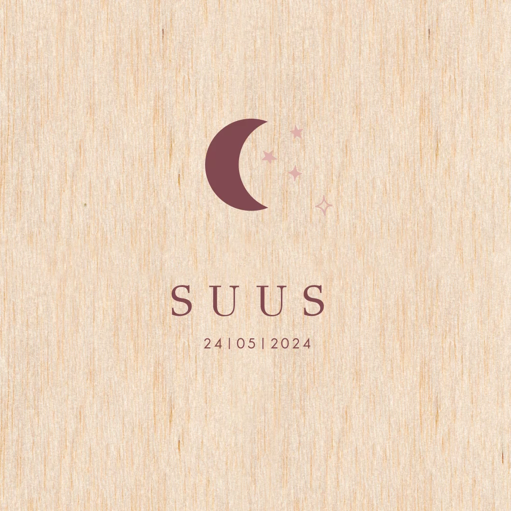 Echt houten geboortekaartje meisje met maan en sterren