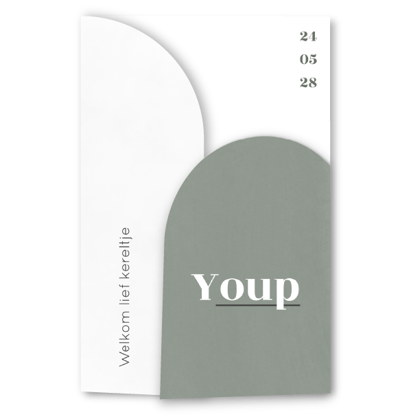 Op zoek naar een tijdloos en origineel geboortekaartje? Dit groene luik geboortekaartje opent vanuit het midden. De vergrijst groene tinten zorgen voor een warme, zachte look die perfect past bij een jongen. De bijzondere boogvorm luikjes maken het kaartje net even anders dan anders. Echt een unieke manier om de geboorte van jullie kindje aan te kondigen.