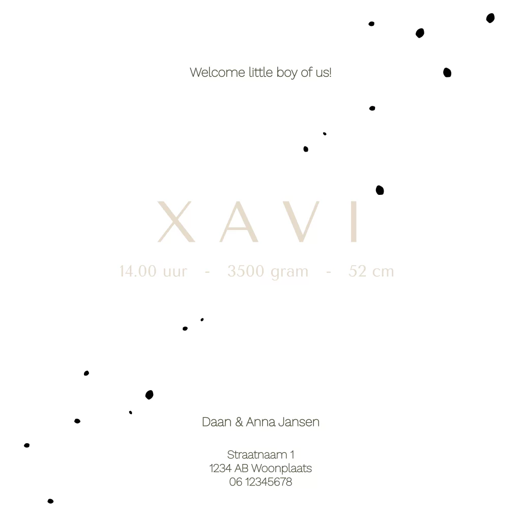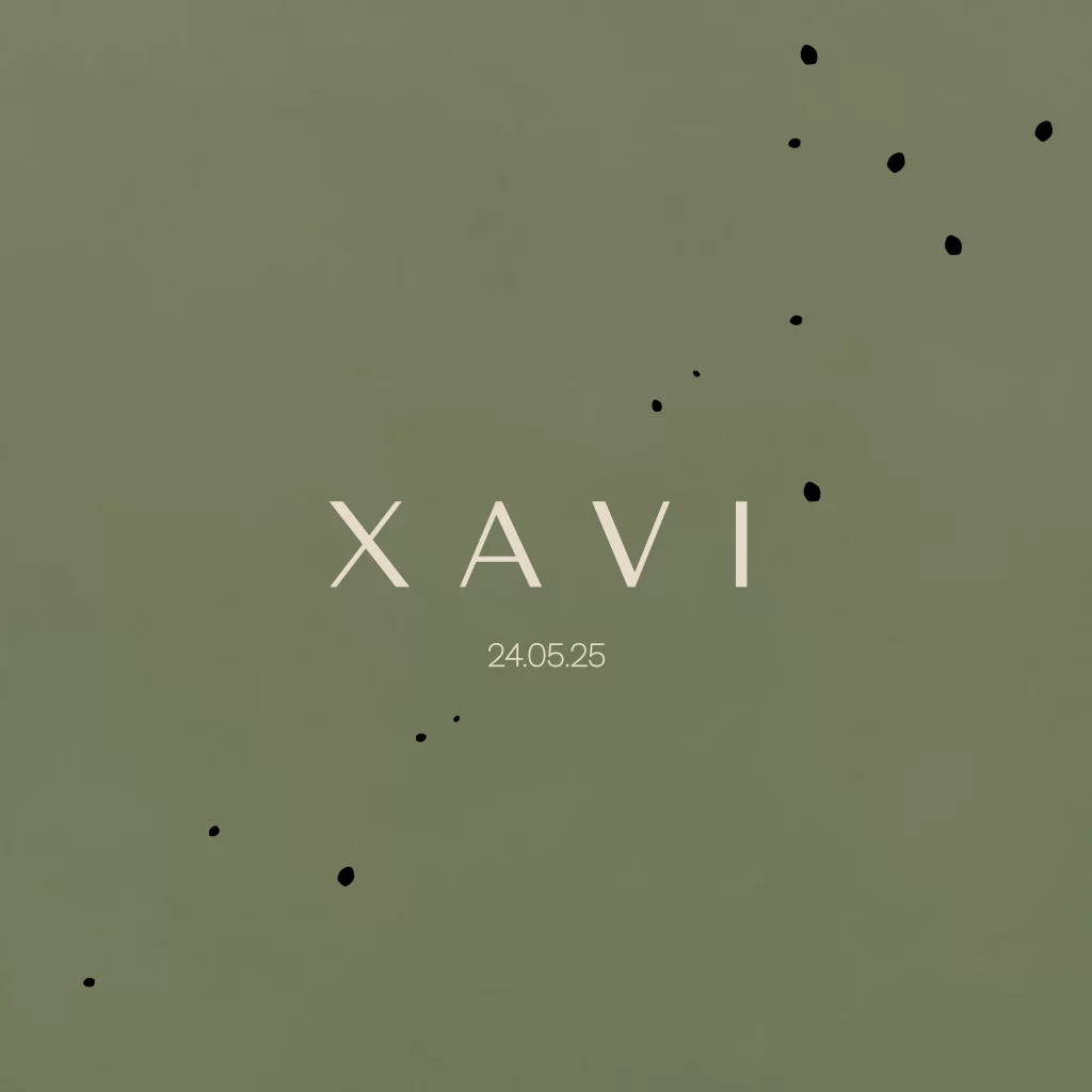 Ontwerp zelf het geboortekaartje voor jullie kindje. Een stoer olijfgroen watercolor geboortekaartje met zwarte spettertjes. Het geboortekaartje kun je helemaal naar wens personaliseren, door kleur, lettertype aan te passen en illustraties toe te voegen.