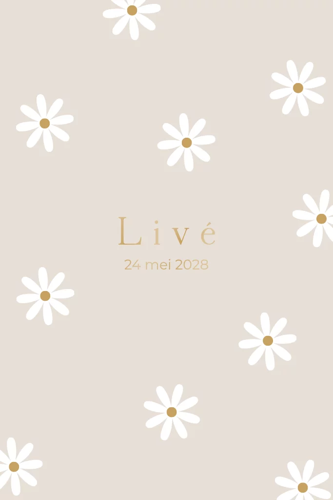 Ontwerp zelf het geboortekaartje voor een meisje met ronde hoeken met aardetinten bloemetjes en takjes. De voorbeeldnaam Livé en andere teksten zijn toegepast met glanslak. Je past het geboortekaartje eenvoudig naar wens aanpassen aan in de online editor.