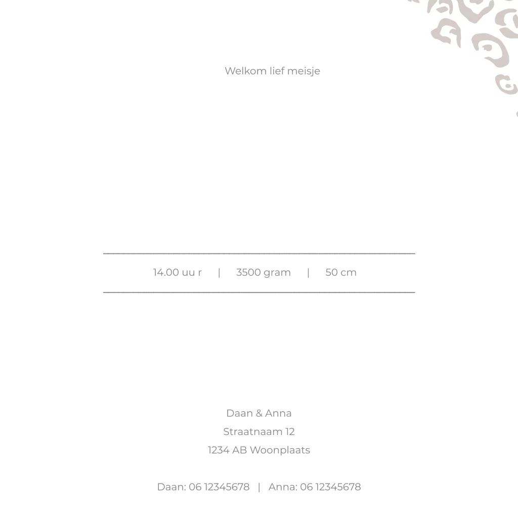 Dit elegante geboortekaartje in warm grijs tinten, panterprint en luxe goudfolie accenten is een perfecte keuze om de komst van jullie dochter te vieren.