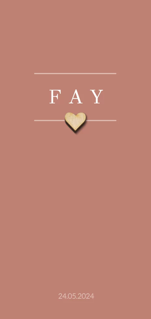 Ontwerp zelf het geboortekaartje voor jullie kindje. Achtergrond, lettertype en kleuren kun je zelf naar wens aanpassen. Let op: Het houten hartje wordt niet afgedrukt of meegeleverd, dit is om aan te tonen waar je het houten hartje kunt plaatsen. Bestel hier de houten elementjes of bestel een sample setje met de proefdruk mee. Prachtig op Oud-hollands structuur karton.