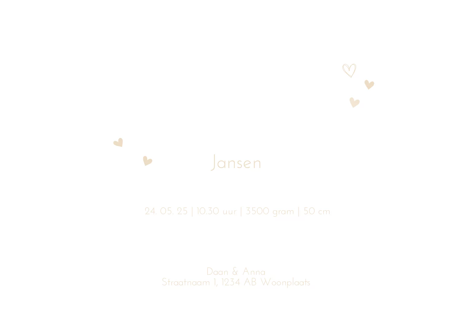 Liggend geboortekaartje meisje met hartjes en goudfolie