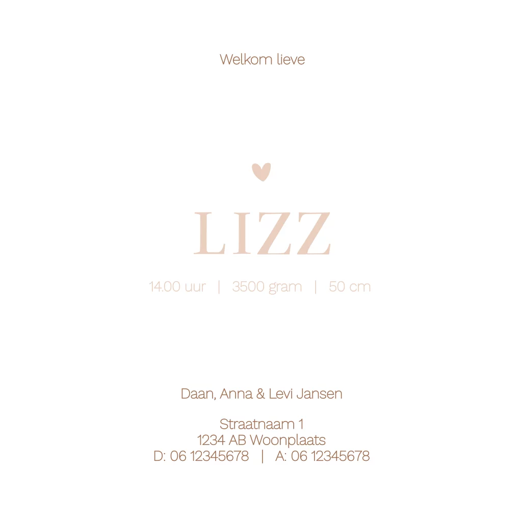 Ontwerp zelf het geboortekaartje voor jullie kindje. Een minimalistisch modern geboortekaartje. Het lettertype, kleur en achtergrond kun je zelf naar wens aanpassen. Prachtig op Oud Hollands structuur karton.