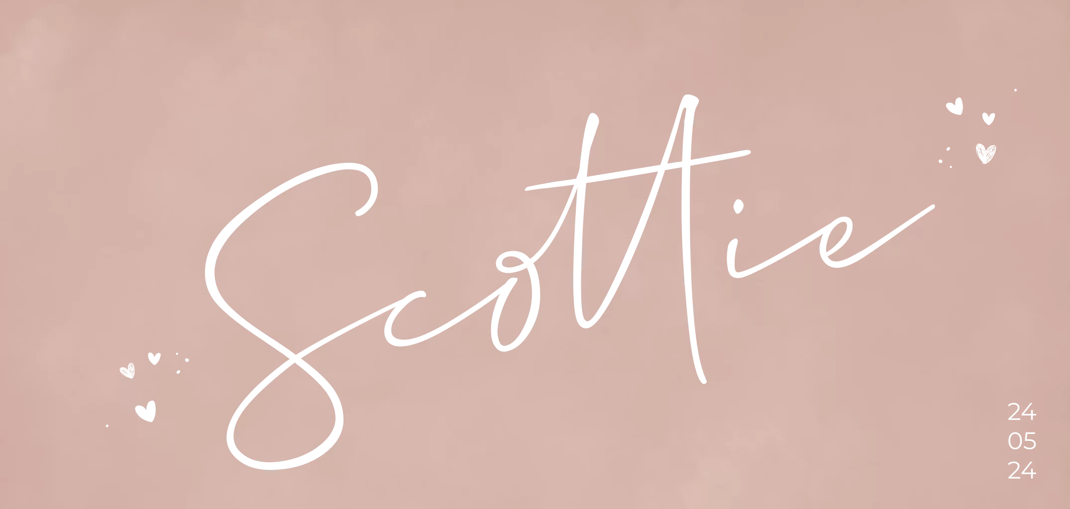 Ontwerp zelf een uniek en modern kaartje voor jullie kindje. Dit minimalistische geboortekaartje heeft een prachtige oudroze velvetlook achtergrond. De voorbeeldnaam Scottie is toegepast met holografisch folie, maar je kunt het geboortekaartje helemaal naar wens aanpassen.