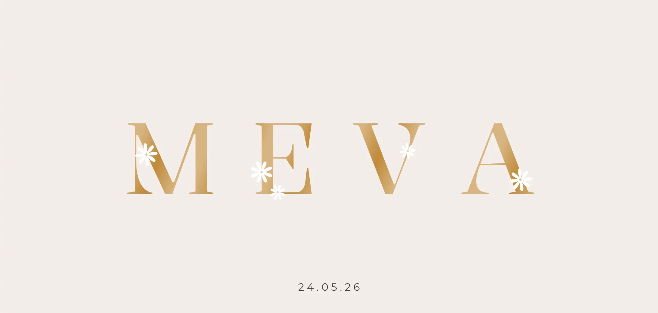 De voorbeeldnaam Meva en de bloemetjes zijn toegepast met glanskleuren. Je past het geboortekaartje eenvoudig naar jouw smaak aan in de online kaarteneditor.