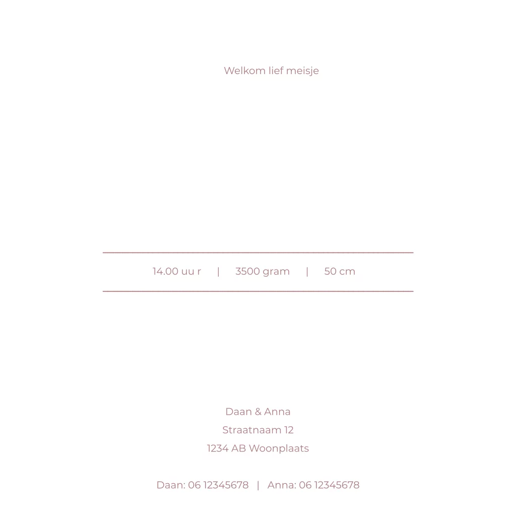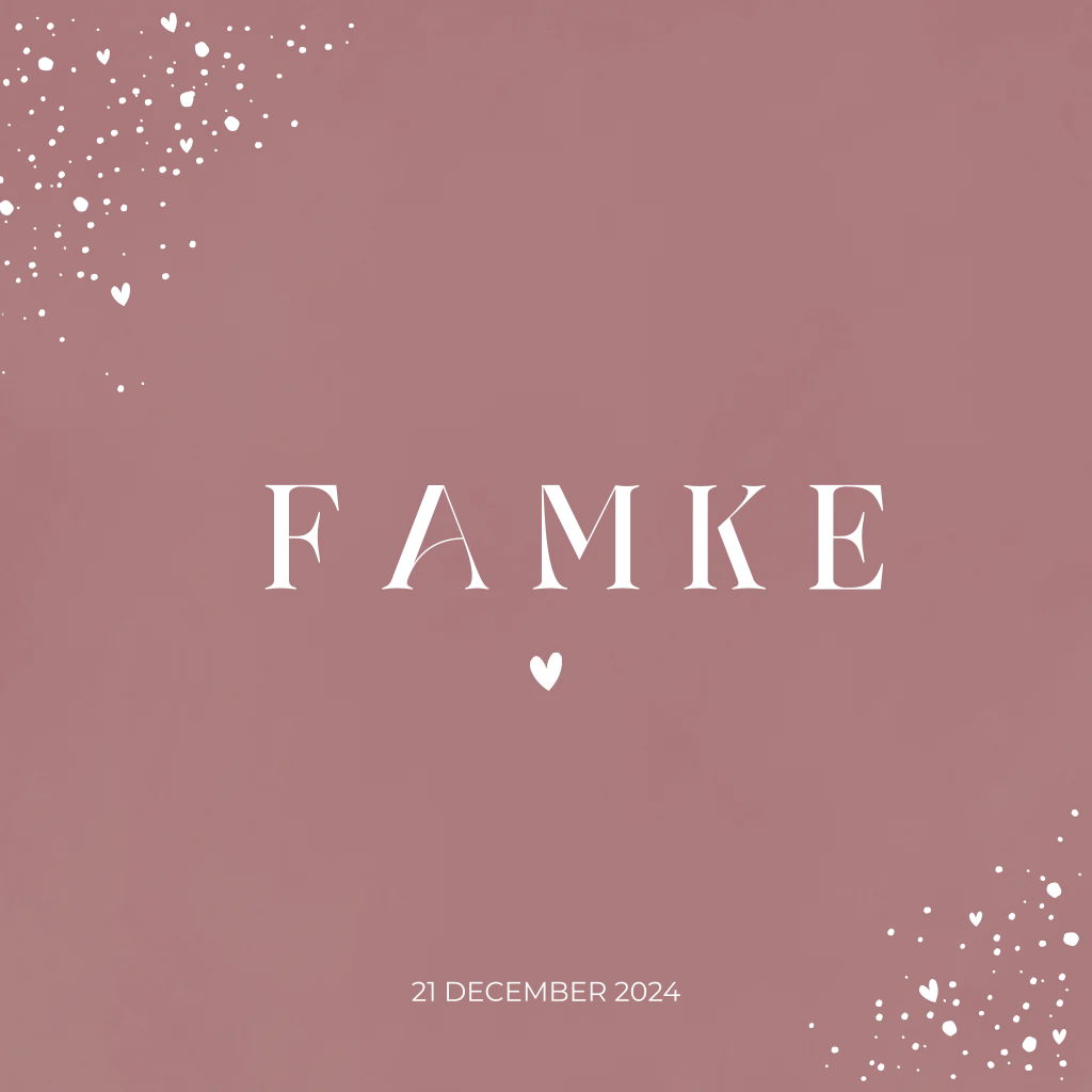 Je past het geboortekaartje volledig naar wens aan in onze online editor, zodat het precies bij jullie wensen aansluit. De naam Famke en de andere accenten zijn toegepast in goudfolie maar kan naar wens worden aangepast.