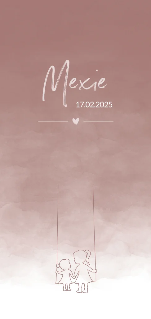 Dit staande geboortekaartje voor een meisje heeft een fijne lijntekening van twee zusjes op een schommel. Een liefdevolle illustratie die de band tussen zussen symboliseert en perfect past bij de aankondiging van een nieuw meisje. De zachte oudroze watercolor achtergrond geeft het kaartje een warme en rustige uitstraling.