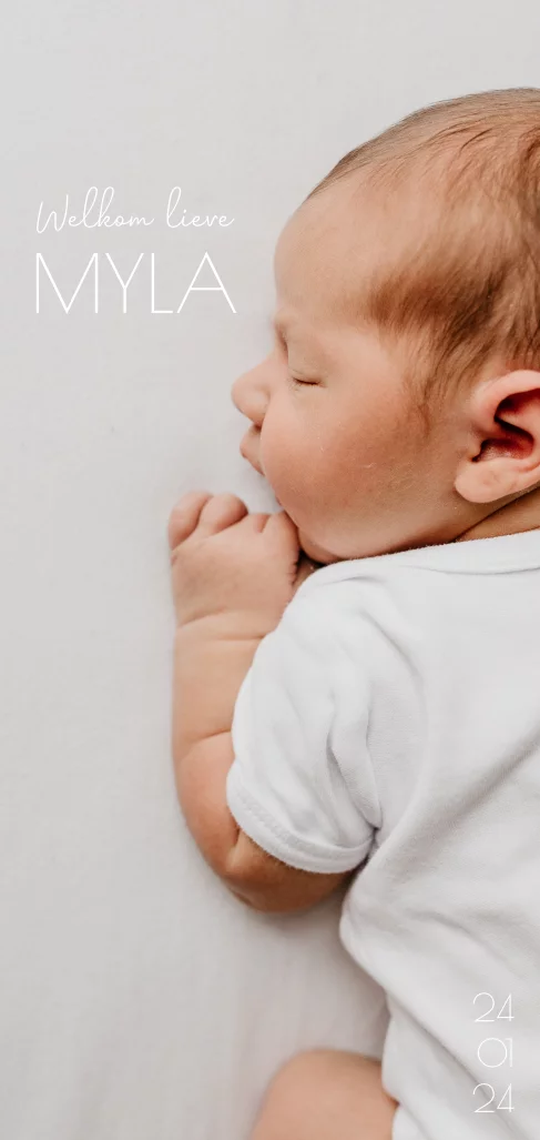 Ontwerp zelf het geboortekaartje voor jullie kindje. Een prachtig modern foto geboortekaartje. Je kunt de kaart helemaal naar wens aanpassen. Foto: Marloes van der Linde Fotografie.