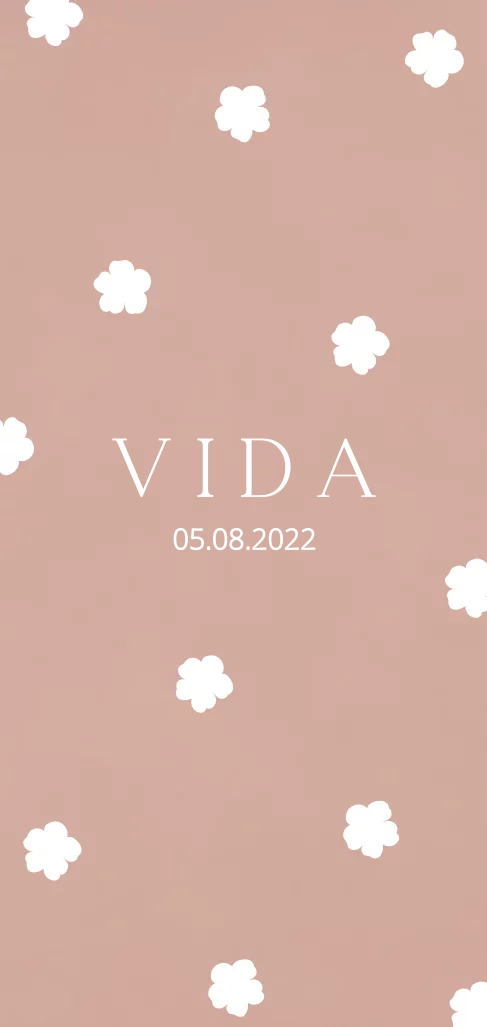 Ontwerp zelf een staand geboortekaartje voor een meisje in met prachtige bloemen. De voorbeeldnaam Vida en haar geboortedatum zijn toegepast met goudfolie. Je kunt de achtergrond, kleur en lettertype naar wens aanpassen en het geboortekaartje personaliseren.
