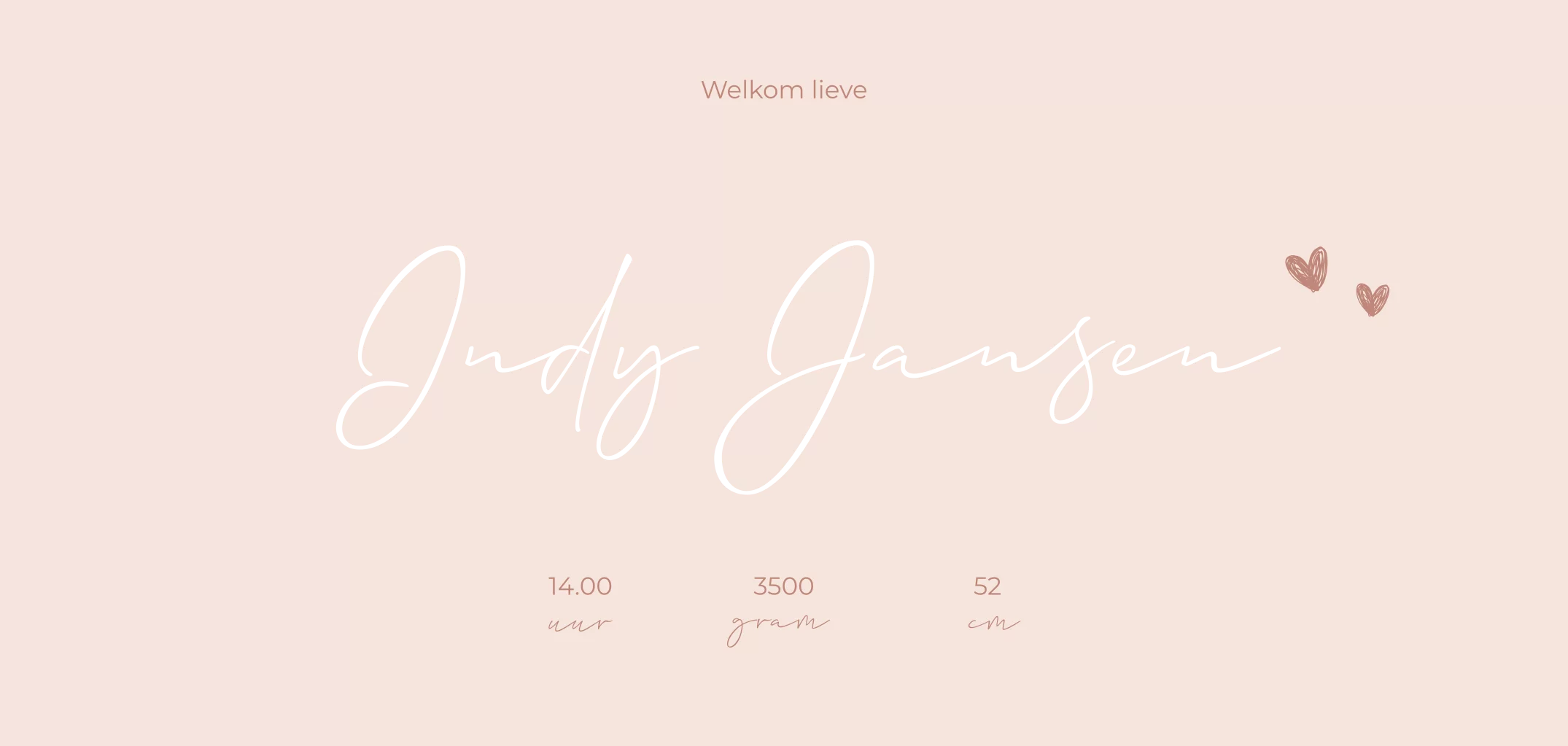 Ontwerp zelf het geboortekaartje voor jullie kindje. Dit prachtig terracotta kleurige liggende geboortekaartje is afgewerkt met goudfolie. De voorbeeldnaam Indy en de hartjes zijn toegepast met goudfolie, maar je past eenvoudig het geboortekaartje helemaal naar aan in de online editor.