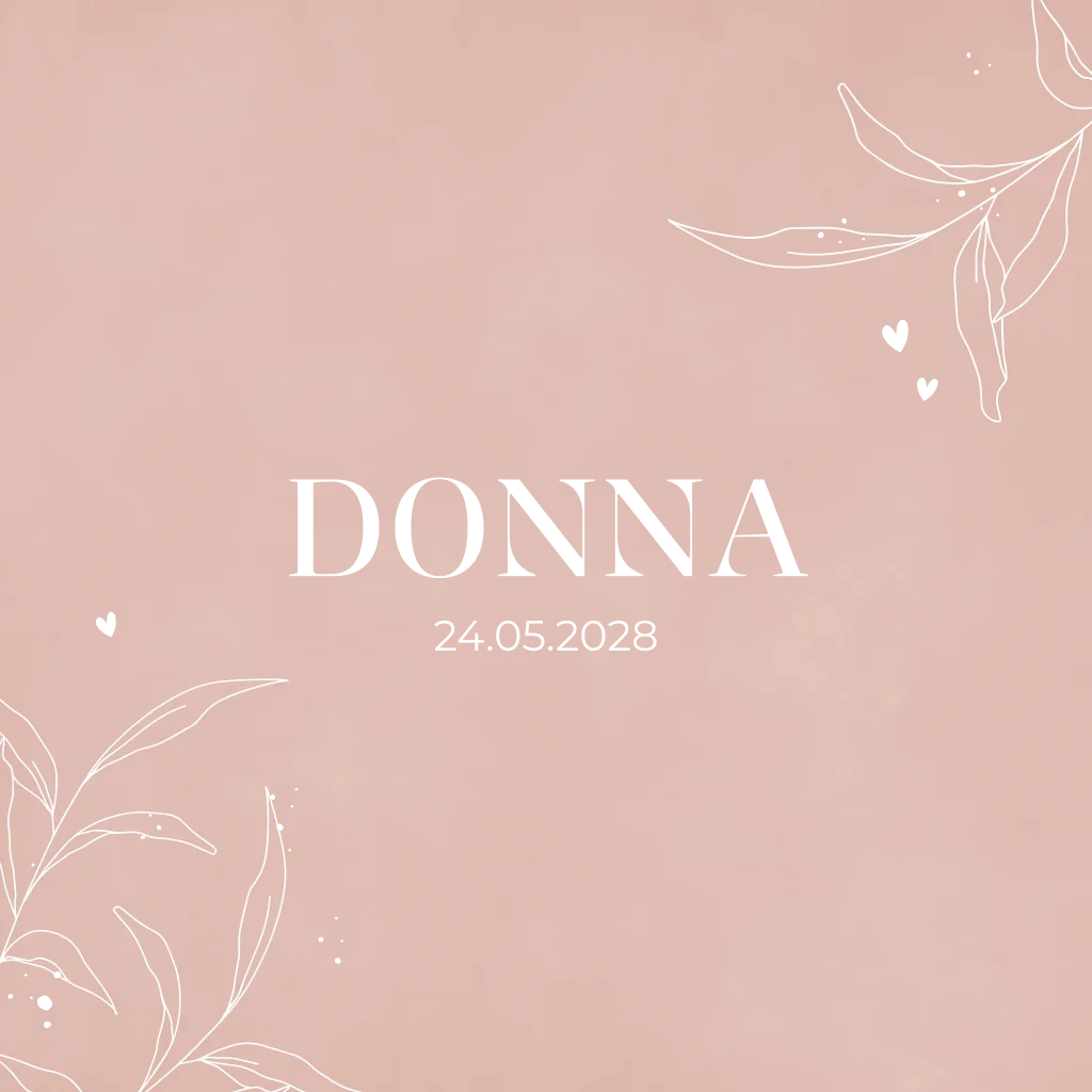 Ben je op zoek naar een modern en stijlvol geboortekaartje voor een meisje? Dit vierkante oudroze kaartje met goudfolie en zachte botanische bladeren heeft een warme, elegante uitstraling. Het ontwerp combineert trendy minimalisme met een lief, natuurlijk accent waardoor het perfect past bij jullie dochter.