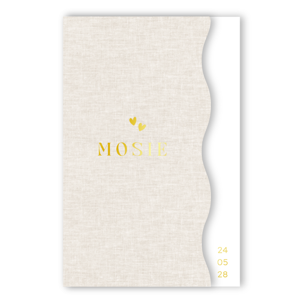 Een stijlvol en tijdloos geboortekaartje met een subtiele linnenlook en een elegante golfvorm. De glanzende goudfolie geeft dit ontwerp een luxe uitstraling, terwijl de neutrale tinten het geboortekaartje perfect maken voor zowel jongens als meisjes.
