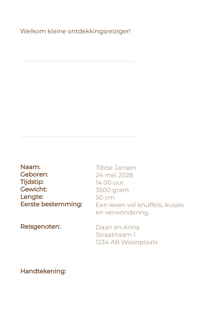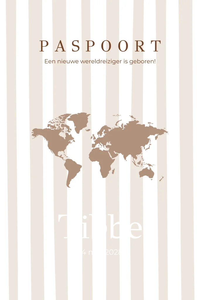 Dit stijlvolle paspoort geboortekaartje is perfect voor kleine wereldreizigers. De zachte beige, bruine tinten in combinatie met glanzende gouden foliedruk maakt dit ontwerp warm, liefdevol en avontuurlijk tegelijk.