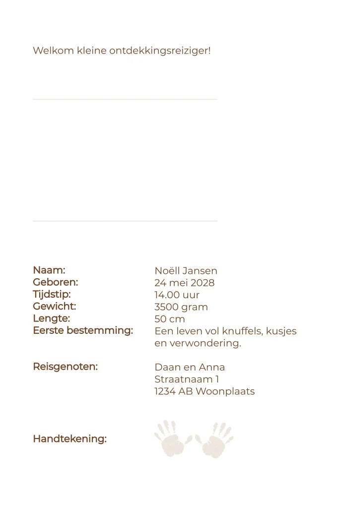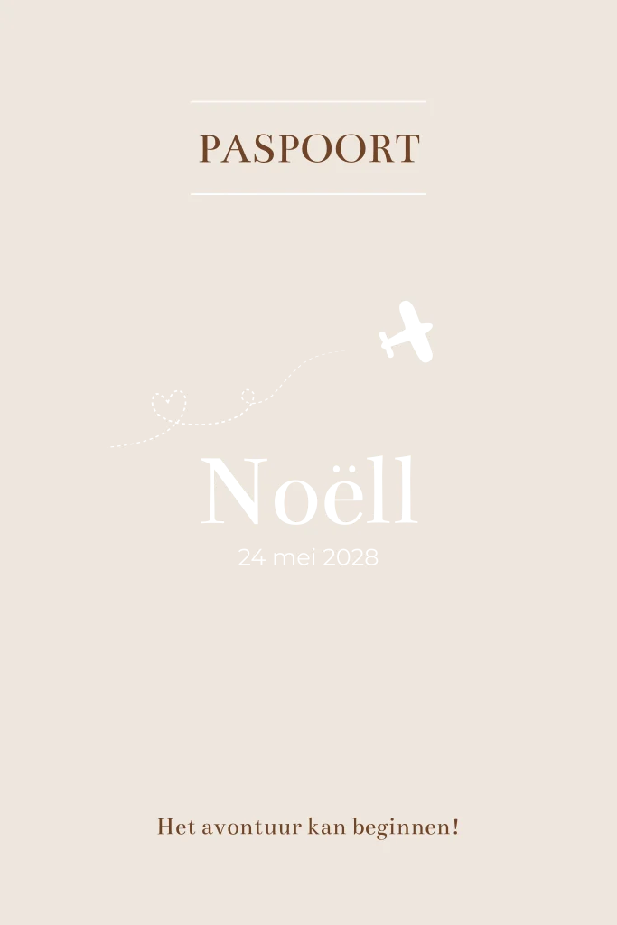 Dit stijlvolle paspoort geboortekaartje is perfect voor kleine wereldreizigers. De zachte beige tint in combinatie met glanzende gouden foliedruk en het speelse vliegtuigje maakt dit ontwerp warm, liefdevol en avontuurlijk tegelijk.