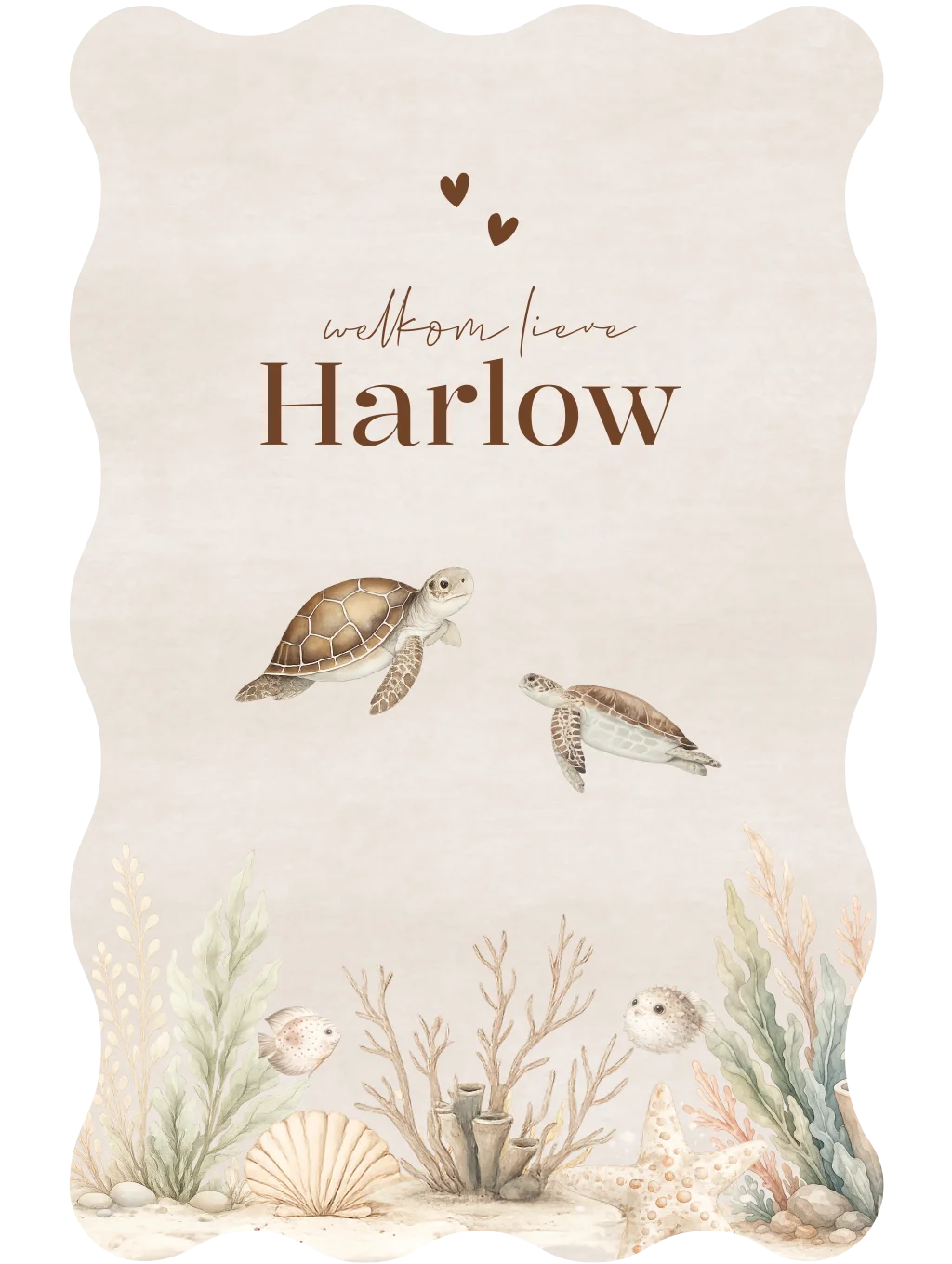Een stijlvol en uniek tuinbord met golvende vorm en schildpadden, voor een warme en bijzondere geboorteaankondiging.