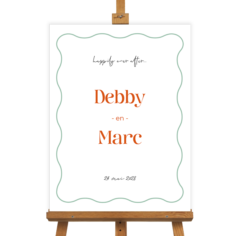 Dit welkomstbord is volledig naar wens aan te passen, zodat het welkomstbord naadloos aansluit bij de trouwkaart, jullie wedding stationery en het thema van de bruiloft.