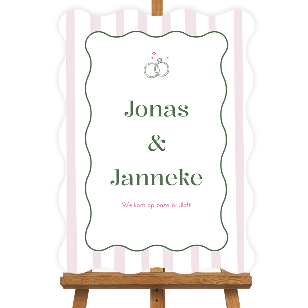De lichtroze strepen geven het bord een frisse, moderne uitstraling. Het kleurenpalet in lichtroze, groen en felgroen sluit perfect aan bij een hippe setting, een buitenbruiloft of een zomers thema.