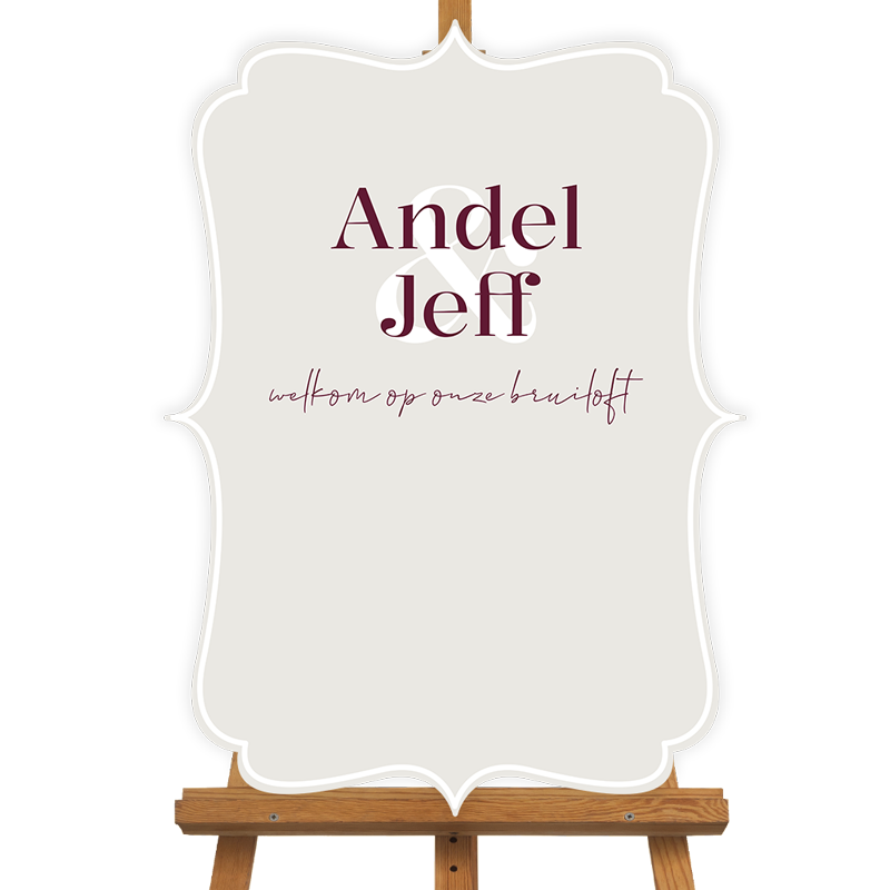 Welkomstbord Andel & Jeff – warm, stijlvol en perfect als eerste welkom op jullie grote dag.