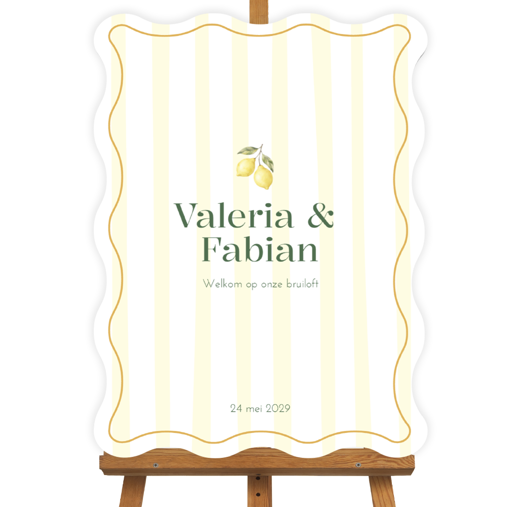 De lichtgele strepen en citroentjes illustratie geven het bord een frisse, zonnige uitstraling. Het kleurenpalet in lichtgeel, okergeel en groen sluit perfect aan bij een mediterrane setting, een buitenbruiloft of een zomers thema.