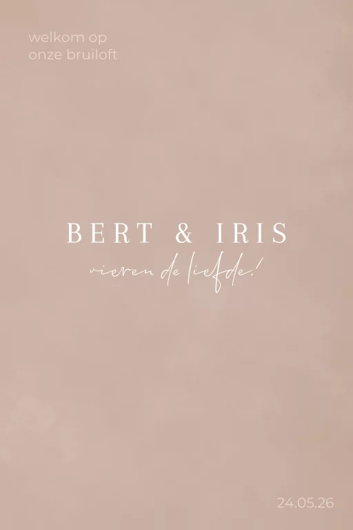 Heet je gasten welkom op jullie bruiloft met dit prachtige moderne welkomstbord, helemaal in stijl van de trouwkaarten en als onderdeel van je trouw huisstijl. Een prachtig welkomstbord met een taupe velvetlook achtergrond. Het lettertype, de achtergrond en kleur pas je eenvoudig naar wens aan in de online editor. Dit moderne weerbestendige welkomstbord is gemaakt van hard, stevig maar licht geschuimd PVC met een subtiele structuur. Dankzij de helder witte toplaag komt de print optimaal tot zijn recht. Het welkomstbord wordt binnen 5 werkdagen bezorgd.