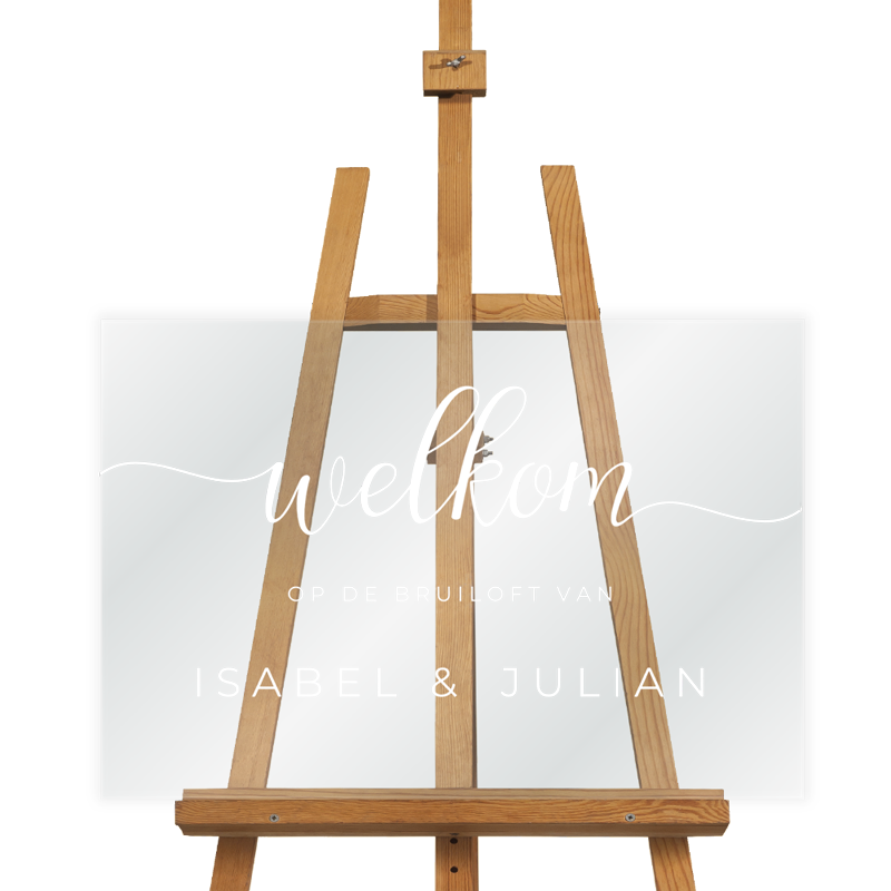 Heet je gasten welkom op jullie bruiloft met een prachtig welkomstbord, helemaal in stijl van je trouwkaarten én als onderdeel van je trouw huisstijl. Een prachtig modern transparant acryl welkomstbord met witte opdruk. Het lettertype, illustraties en kleur pas je eenvoudig naar wens aan. Dit elegante weerbestendige welkomstbord is gemaakt van transparant acryl van 5 mm dik (ook wel bekend als plexiglas). Het welkomstbord wordt binnen 5 werkdagen bij je bezorgd.