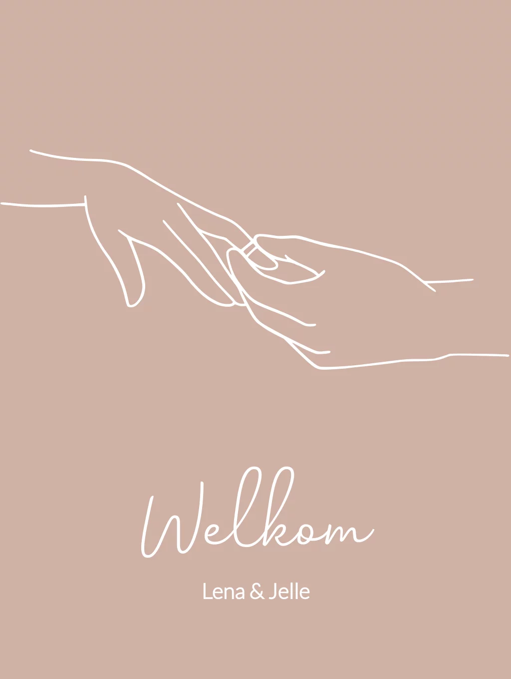 Heet je gasten welkom op jullie bruiloft met een prachtig welkomsbord, helemaal in stijl van je trouwkaarten en als onderdeel van je trouw huisstijl. Een prachtig minimalistisch welkomsbord met een handen line art illustratie. Het lettertype, illustratie en kleur kun je naar wens aanpassen. Dit stoere weerbestendige welkomsbord is gemaakt van hard, stevig maar licht geschuimd PVC met een subtiele structuur. Dankzij de helder witte toplaag komt de print optimaal tot zijn recht. Het welkomstbord wordt binnen 3 werkdagen bezorgd.
