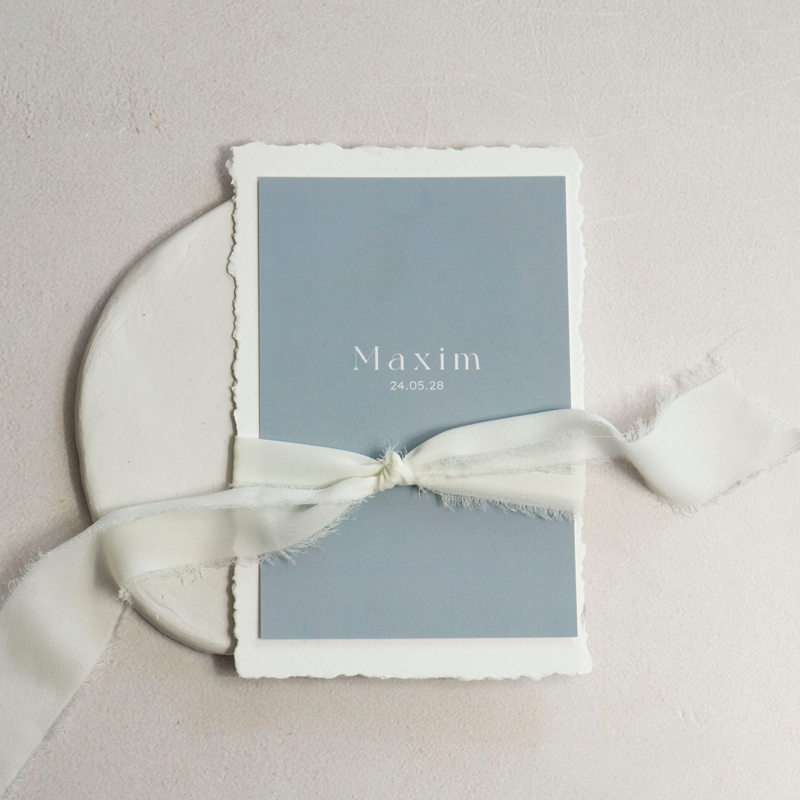 Op zoek naar een bijzonder geboortekaartje met een verfijnde, minimalistische uitstraling? Dit geboortekaartje is perfect voor wie houdt van een verfijnde stijl. De bovenste kaart heeft een zachte grijzige blauwtint met daarop de naam en geboortedatum van jullie kindje. De tweede kaart heeft een handgeschept look en bevat alle geboortegegevens op de achterzijde.