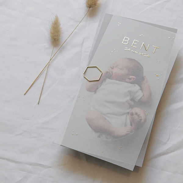 Een tweedelig geboortekaartje met kalkpapier. Voeg een foto van je kleintje toe en pas het kaartje helemaal naar wens aan. De voorbeeldnaam Bent en de spettertjes zijn toegepast in goudfolie. Je kunt de kaart naar wens aanpassen. Maak de transparante kaart vast aan de achterkaart met een touwtje of fluweel lint een paperclip of een splitpen