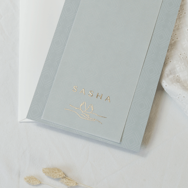 Een tweedelig geboortekaartje met kalkpapier met een warm groene achterkaart. Op het kalkpapier is de voorbeeldnaam Sacha toegepast in goudfolie. Je kunt de kaart naar wens aanpassen. Maak de transparante kaart vast aan de achterkaart met een touwtje of een paperclip
