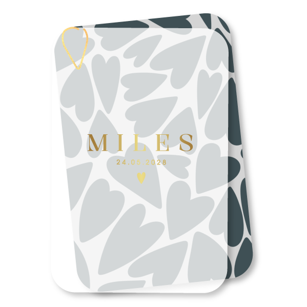 Vier de geboorte van je kleintje met dit prachtige colorblocking geboortekaartje. Dit bijzondere ontwerp bestaat uit twee lagen: een transparante kalkpapieren voorzijde bedrukt met subtiele hartjes en je baby’s naam in chique goudfolie, en een stevige achterkaart met alle geboortegegevens in een modern design.