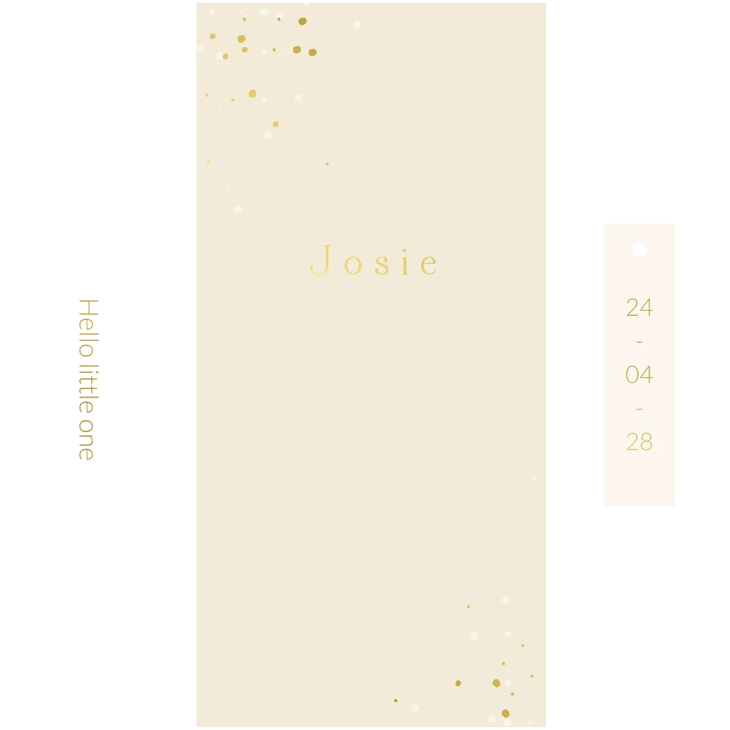 Een prachtig licht geel geboortekaartje met spettertjes. In de labeltjes zitten kleine gaatjes waar je een touwtje of fluweel lint in aan kunt brengen om de labeltjes aan het geboortekaartje te bevestigen. Je kunt de achtergrond, kleur en lettertype naar wens aanpassen en het geboortekaartjes personaliseren. De voorbeeldnaam Josie is gedrukt in goudfolie, maar kun je naar wens aanpassen. Het formaat van het geboortekaartje is 10x21cm en past in een envelop van 11x22 cm.