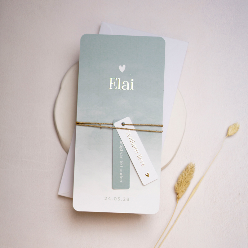 Dit geboortekaartje is volledig aanpasbaar naar jouw wensen. Je kunt de achtergrondkleur, het lettertype en zelfs de naam in goudfolie personaliseren.